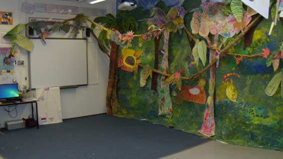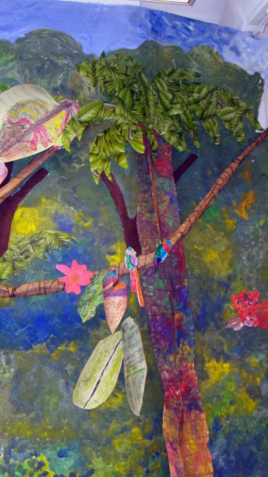 It was a hectic process with over 400 children, a different group every half hour, working together to make a wonderful painted backdrop for the art room and decorating it with their own leaves, flowers, animals and 3D birds.