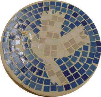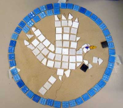 These are children’s drawings for small roundels which are displayed opposite a larger outdoor mosaic. You can see with the work in progress photographs of the ‘dove’ roundel particularly how the process works