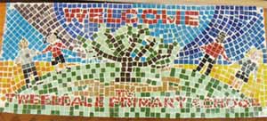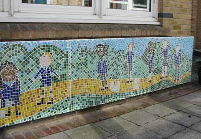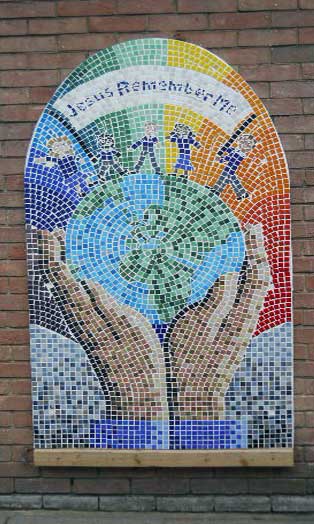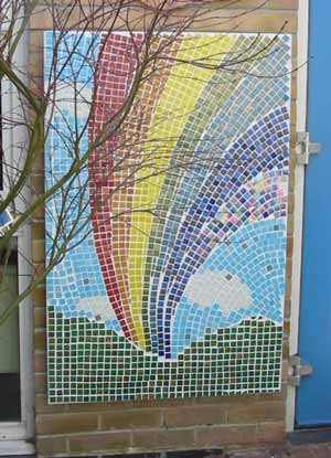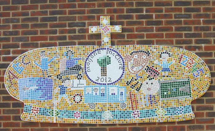 Finally, this is the finished mosaic in situ. It is approximately 1.8m x 1.5m overall and took five days for the children to make.