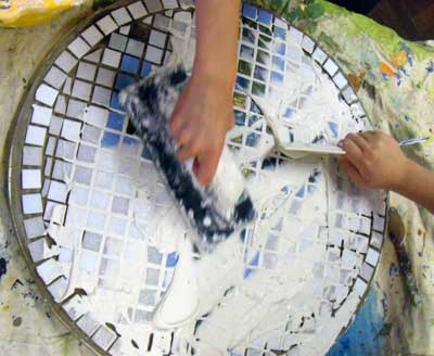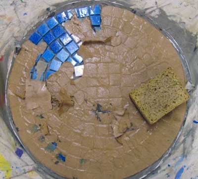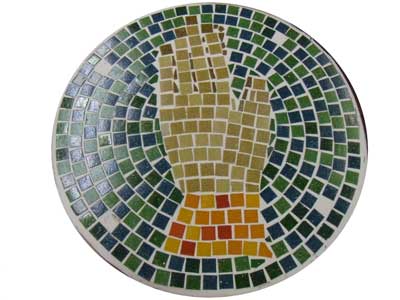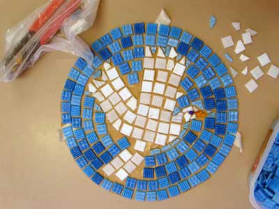 This is the roundel finished apart from inserting small cut tiles into the gaps – I cut the tiles and only older children would stick cut tiles down. Once this has been done the board is covered with tile adhesive and the tiles turned over onto it with the paper on top. It is left to dry and then the paper is removed.
