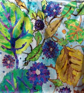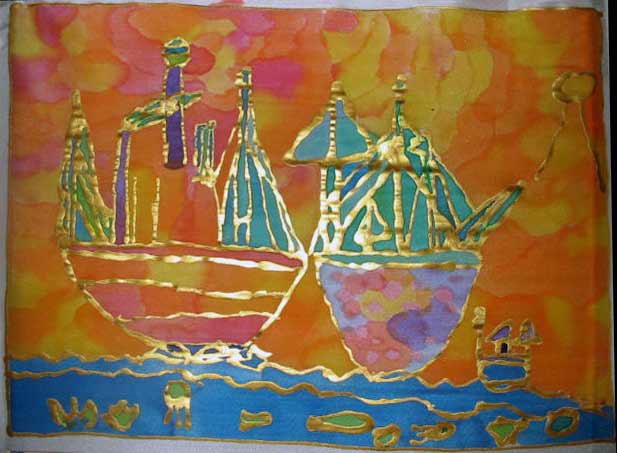 Since most schools don’t have specialist equipment for silk painting I have come up with a couple of ideas to make silk painting work. Silk is reasonably inexpensive and the paints go a long way but the biggest expense is the gutta so I often get the children to work in pairs (that way you only need 15 tubes of gutta rather than 30). I start off with getting the children to draw their ideas and then putting the designs underneath pongee silk (which is quite fine). That way you can trace over the silk with the gutta. Tape the paper and silk to the table and then as soon as the gutta has been applied, lift up one edge and remove the paper (you don’t want it drying and sticking to the silk). Next, you want the silk to dry without touching the table. Either tape or pin it to batons or place some pieces of dowl or old paint brushes underneath the silk and tape the sides of the silk so that it it stretched over the brushes/dowl etc. Then when you do the painting the silk won’t be toucing the table either (which is very important otherwise the paint spreads all over and under the gutta). If possible let the silk with the gutta and paint dry overnight. You can adapt this to different sizes of silk and if you are doing a large piece then make a baton framework to pin/tape the silk to once the gutta has been applied. You can use batik with either hot wax or (even better) cold wax, and dyes but I find it’s best to use proper silk paints and silk outliner/gutta.