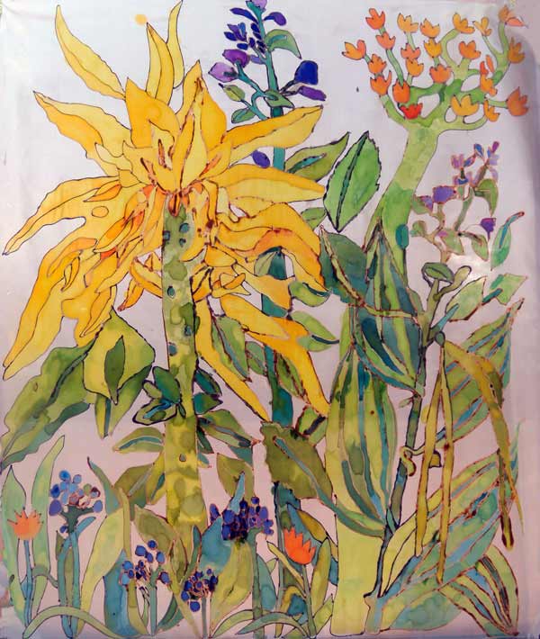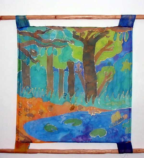 silk-storytelling-batiksilk-storytelling-batik-2silk-storytelling-batik-3Silk painting can also be used to make brilliant wall hangings for schools.  These wall hangings were make by a Year 5 group who had been to Hindleap Warren Activity Centre and using drawings based on their week there, they made four wonderful banners.