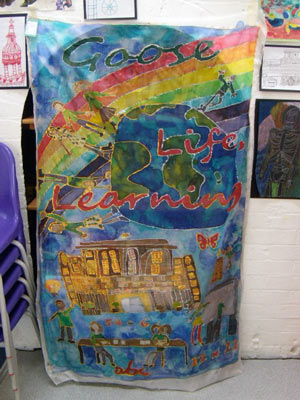 Goose Green Primary wanted something bright and eye catching at the entrance to their school. Two silk banners using the children’s drawings and based on the school moto of ‘Life, Learning and Laughter’ seemed to fit the bill. I came up with several designs for the school to choose from and then worked with a selection of children throughout the school to make them.