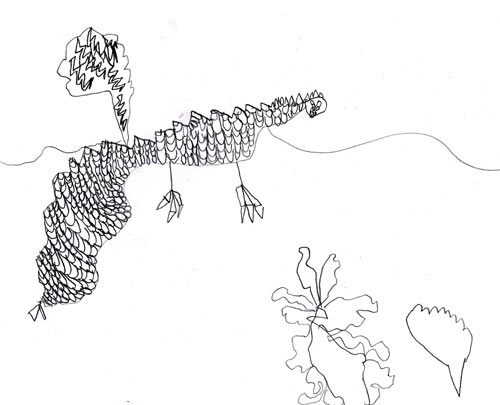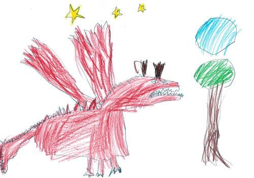 This was a one day project working with Year 1 children to make five silk banners.  Each class table made a banner 1m x .5m, and their teacher sent me their drawings prior to our project so that I could work out a simple design from them.  These are the dragons for each banner: