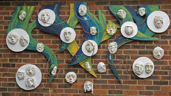 The ‘faces’ mural used relief plaque faces made by the pupils which were the base for the latex moulds. A particularly effective touch is the copper tubing which winds round the boards and which should weather beautifully with time.