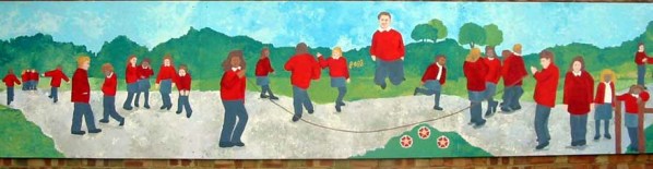 Playground Mural painted by Infant School children in Sutton using images of themselves that they took with a digital camera.