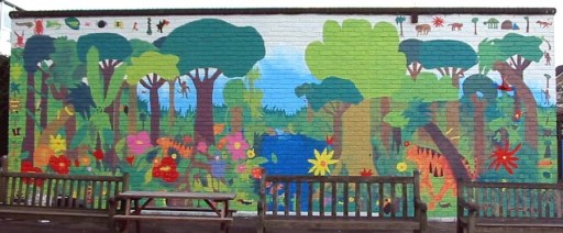I specialise in outdoor and indoor wall murals. I bring the student’s drawings together into a final design and then provide the support and technical help to allow them to transfer the design onto the wall or boards before the students paint the mural(s). I like the students experience everypart of the project and do the majority of the work. That way they gain the most knowledge and have the most fun!