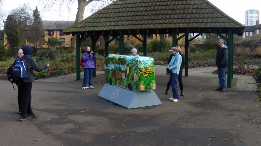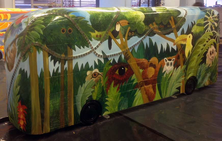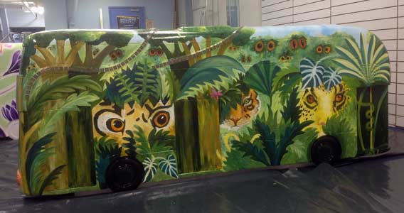 I think the finished ‘bus’ remained quite true to the original design and I had great fun with the mosaic ‘creepers’ and painting it. The sculpture is now situated on a specially constructed plinth in Wandle Park in Croydon and will be on display throughout December 2014. Here are photos of it in the studio once it was painted and varnished: